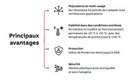 - Indice de protection IP65/IP66 selon EN/IEC 62208 : indice de résistance aux chocs IK08 selon EN/IEC 62208 (IP54 et IK07 pour coffrets avec porte transparente).