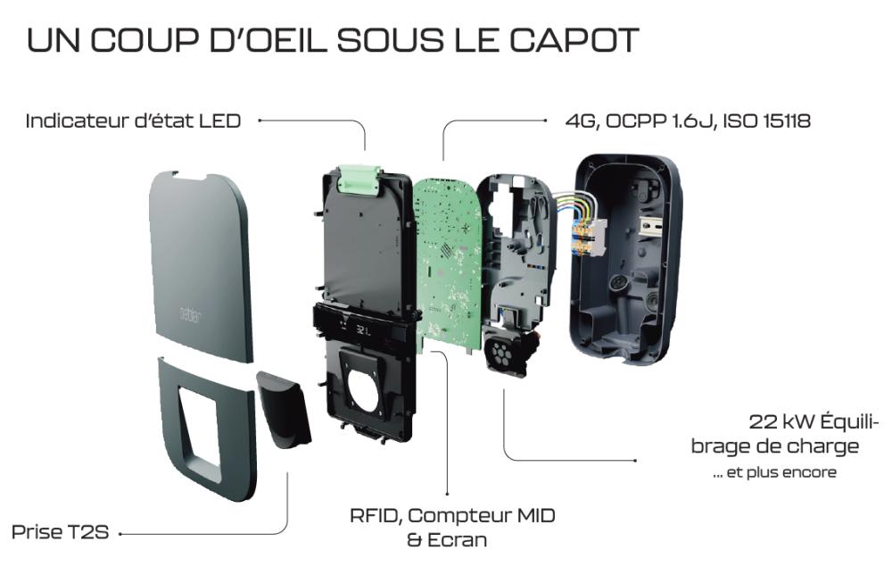 - Connectivité 4G, Ethernet, Wi-Fi, compatibilité OCPP 1.6J et conformité ISO 15118