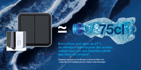Il s’agit d’une nouvelle version de cubyko, le 1er modèle écoconçu sur le marché de l’appareillage mural étanche, avec au moins 27% de plastique collecté près des océans.
