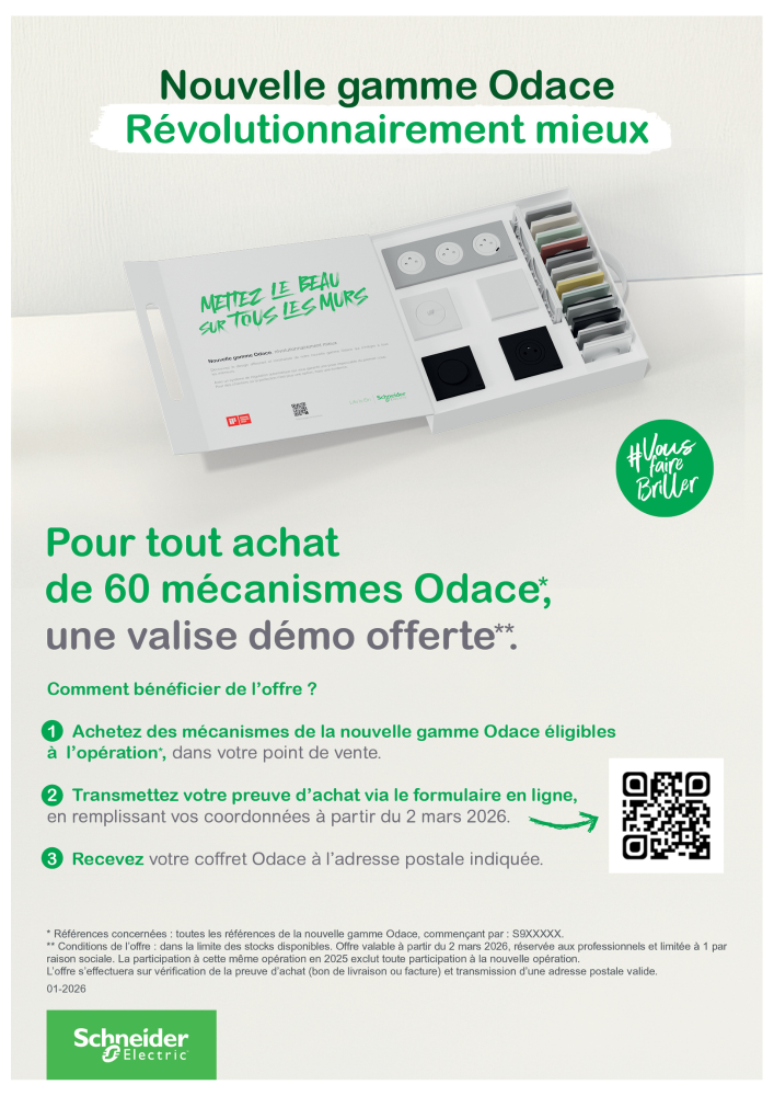 Pour tout achat de 60 mécanismes Odace, une valise démo vous est offerte.
